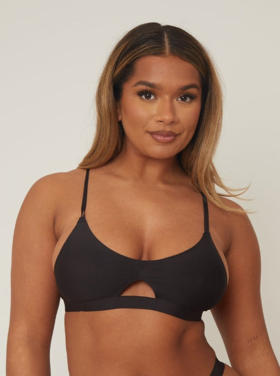 Sujetador negro súper suave, cortado a láser, con diseño de ojo de cerradura y detalles en la espalda. Con dos tirantes delanteros tipo "espagueti", este bralette ecológico ofrece apoyo y comodidad.
